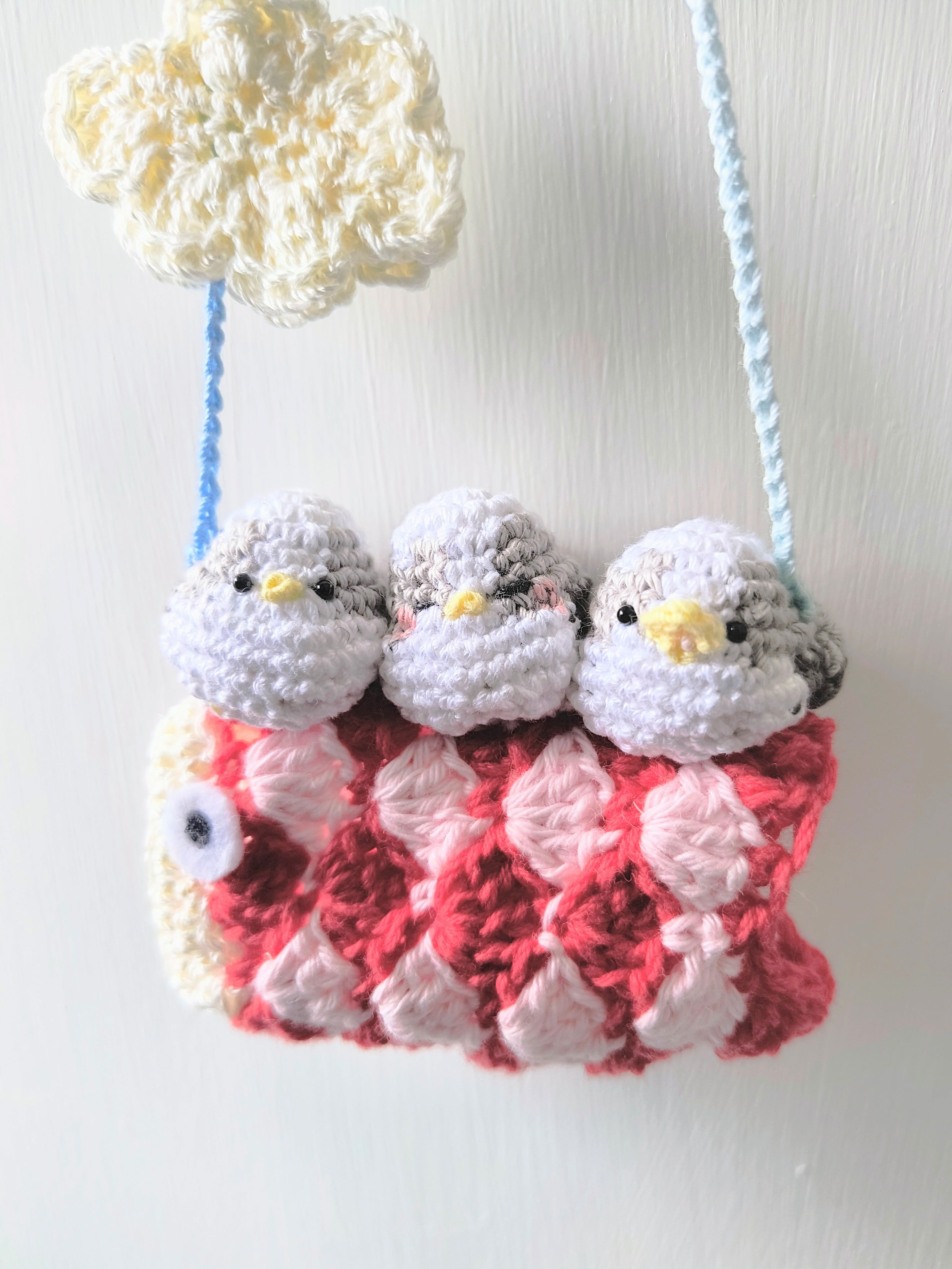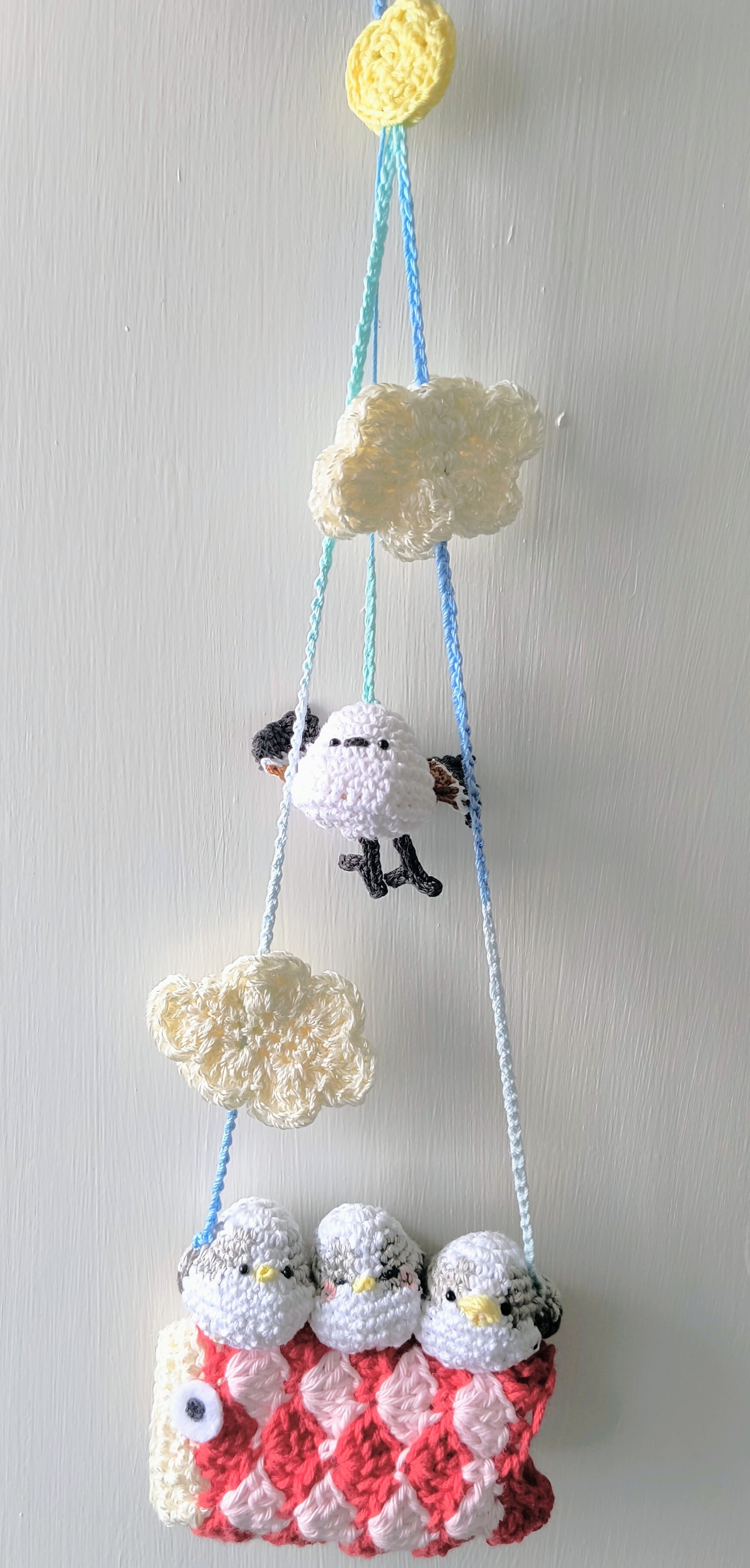 親鳥のシマエナガが一緒に空を泳ぐ姿をイメージして制作しました。