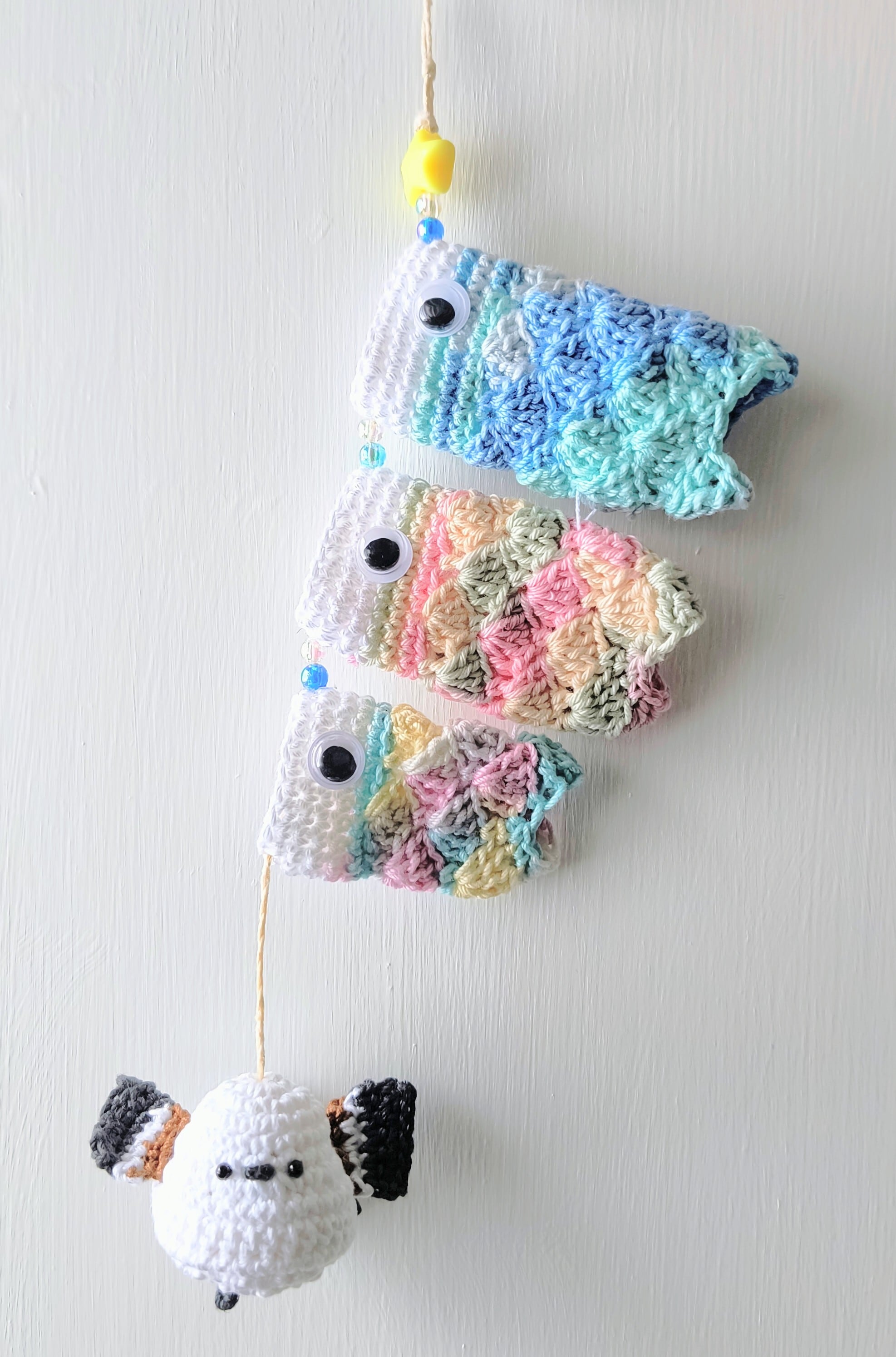 鯉のぼりの親子とシマエナガが一緒に楽しく空を泳いでいる様子をイメージして制作しました。